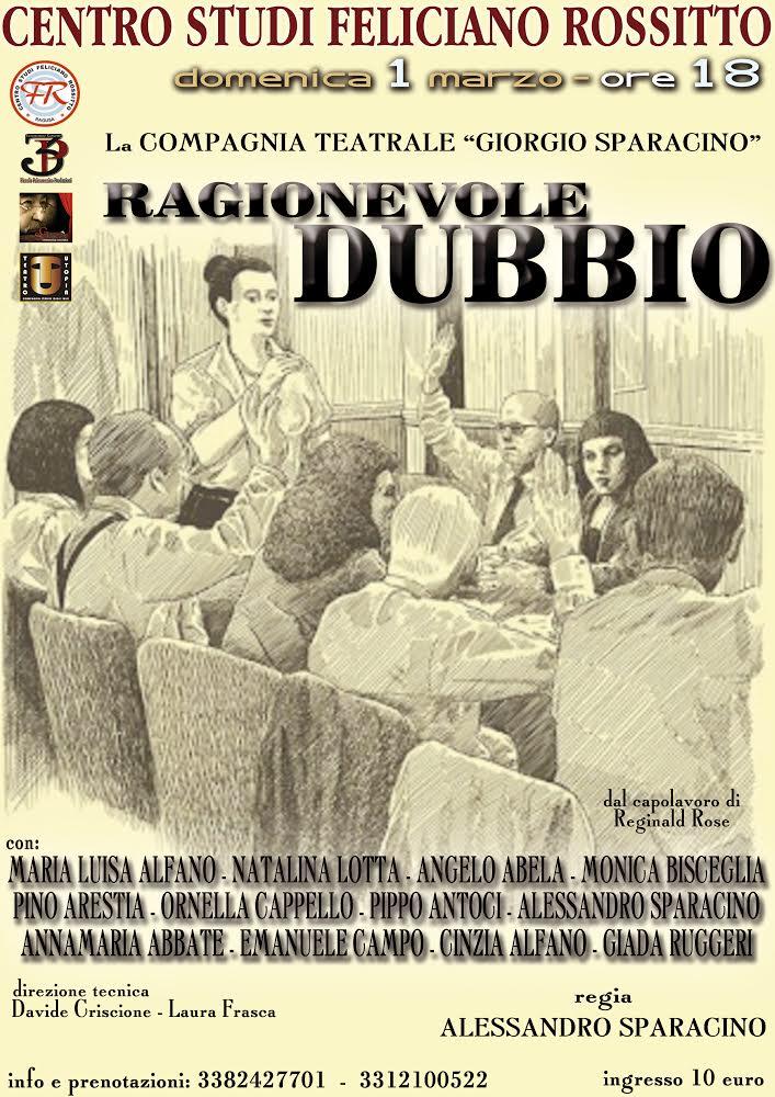 Ragusa, 24 febbraio 2020 – Domenica 1° marzo alle ore 18 presso l’Auditorium del Centro Studi Feliciano Rossitto (Via Ettore Majorana 5, Ragusa) la Compagnia teatrale “Giorgio Sparacino” metterà in scena “Ragionevole Dubbio”, tratto dal capolavoro di Reginald Rose.