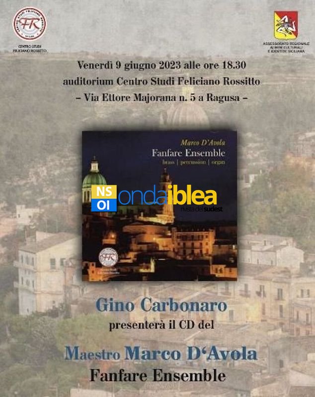 Ragusa, 5 giugno 2023 — Venerdì 9 giugno 2023 alle ore 18.30 presso l’auditorium del Centro Studi Feliciano Rossitto (Via Ettore Majorana 5 a Ragusa) lo scrittore e fisarmonicista prof. Gino Carbonaro presenterà il CD del maestro Marco D’Avola, “Fanfare Ensemble”.