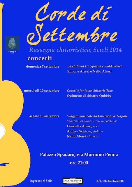 Scicli, 3 settembre 2014 – La rassegna “Corde di settembre, Scicli 2014” nasce con l’impegno di dare spazio e voce ad uno strumento ed un repertorio musicale tra i più amati e popolari, ma paradossalmente meno conosciuti e meno presenti nelle programmazioni concertistiche: la chitarra e la sua letteratura (dalla musica barocca a quella contemporanea).