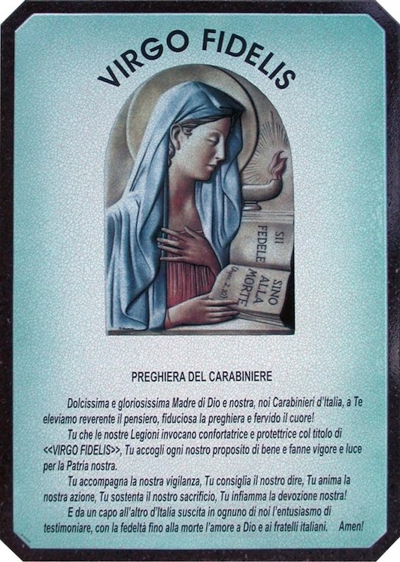 Durante la cerimonia verrà recitata la “Preghiera del Carabiniere”, mentre il Comandante Provinciale terrà una breve allocuzione rievocativa e, al termine, sarà intonato da parte di tutti i presenti e dal coro parrocchiale l’“Inno alla Virgo Fidelis”.
