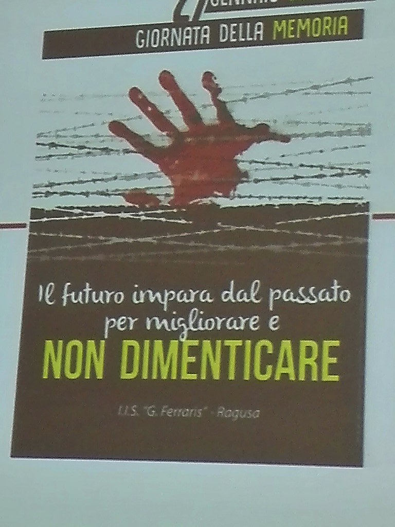 Gli studenti delle scuole della città hanno dato spazio a questa riflessione e ad altre ancora con iniziative private all’interno degli istituti di appartenenza o alla Camera di Commercio, su invito della Prefettura di Ragusa e dell’Ufficio Scolastico Provinciale. Fra le iniziative private all’interno degli istituti scolastici anche quella dell’I.I.S “FERRARIS” i cui studenti hanno dato vita a diversi momenti significativi sotto lo slogan “Il futuro impara dal passato per migliorare e non dimenticare”. Gli studenti del liceo artistico hanno realizzato anche le locandine e i segnalibro con i versi di “VIAGGIO AI CONFINI DELL'ANIMA” della scrittrice, nonché insegnante Marinella Tumino. I segnalibro sono stati scelti dal Prefetto S.E. Dott.ssa Maria Carmela Librizzi, coadiuvata dalla Dott.ssa Gianna Licitra, per essere donati alle Autorità presenti alla Commemorazione presso la Camera di Commercio. Nell’auditorium di via Pietro Nenni, diretto dalla professoressa Daniela Piccitto, si è cantato con il duo “Buio en Polvo” sulle note di “Auschwitz” di Guccini , su altre canzoni sul tema; si è dato vita poi ad Reading curato dagli alunni della IV AL e si è parlato de “La persecuzione degli Ebrei in Sicilia” con un interessante intervento della professoressa , nonché ricercatrice, Tullia Giardina. “ In questi ultimi anni- ha sottolineato la Giardina- credo che sia importantissimo ricominciare a parlare di Shoah, intesa sia come momento storico drammatico, cesura della storia del ‘900 ma anche drammatico della società in cui viviamo noi. Di ieri la notizia della costruzione di un muro a confine con il Messico, 11 miliardi di dollari occorrenti per la sua realizzazione che invece potrebbero salvare varie situazioni del pianeta. Con l’abbattimento nell’’89 del muro di Berlino avevamo pensato che l’uomo potesse ritornare a dialogare e invece questo nuovo muro ci riporta nella drammatica realtà: la natura umana ha sempre bisogno di individuare un nemico, di avere qualcuno da combattere e distruggere” . La Giardina si è soffermata poi sulle testimonianze storiche della presenza di sei donne ebree nella provincia di Ragusa che vennero avviate al lavoro coatto. Pur provenendo da differenti città italiane erano in provincia per legami familiari con uomini del luogo ma che si trovarono esposte ad un’analisi umiliante e degradante di tutta la loro vita. La loro storia venne assoggettata ad un controllo continuo per dimostrare se fossero o meno ebree. Alcune furono cautelate perché imparentate con personaggi di spicco della Ragusa fascista. Altre subirono sorti diverse. La documentazione di queste donne si trova nell’Archivio di Stato di Ragusa. In auditorium, poi, anche la proiezione di un video “Giornata della Memoria” realizzato dagli alunni della V C Meccanica.