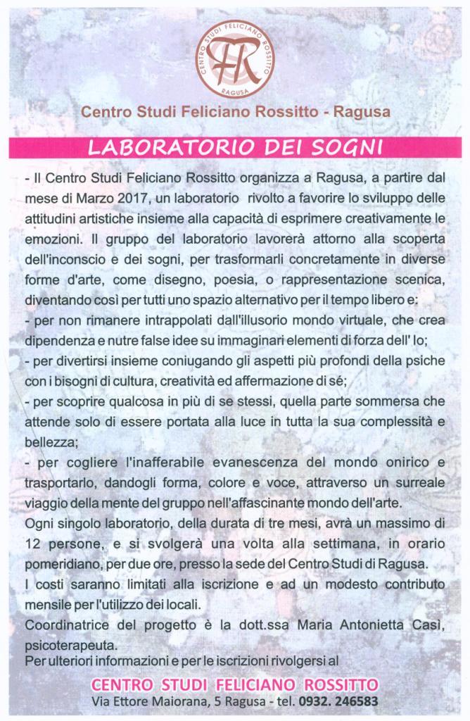 Ragusa, 10 marzo 2017 – Il Centro Studi “Feliciano Rossitto” organizza a Ragusa, a partire dal mese di Marzo 2017, un laboratorio rivolto a favorire lo sviluppo delle attitudini artistiche insieme alla capacità di esprimere creativamente le emozioni.