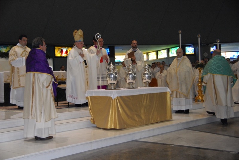 Durante la solenne liturgia sono stati benedetti gli oli santi. L’olio dei catecumeni, l’olio degli infermi e l’olio del Crisma.