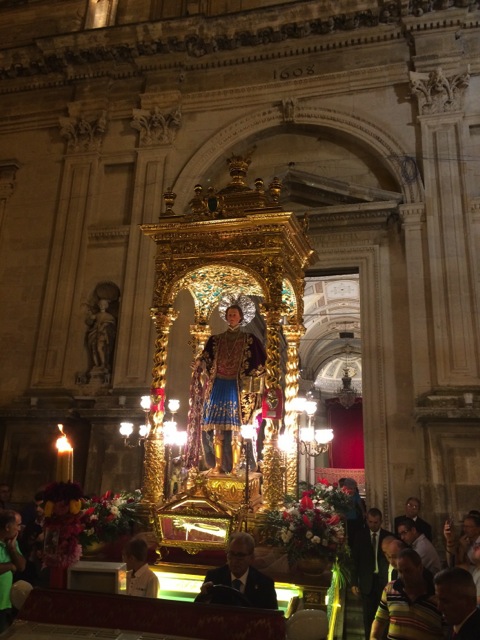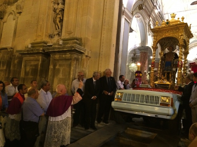 Chiaramonte Gulfi, 1 settembre 2014 – Il simulacro di San Vito è uscito dalla chiesa madre di piazza Duomo, a Chiaramonte Gulfi, trasportato da un mezzo motorizzato, è stato portato in processione accompagnato dalle bande.
