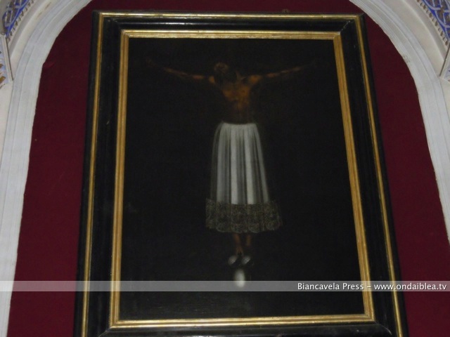 La particolarità è una tela del pittore Burgos, rappresentante “Il Cristo in gonnella”, ovvero Gesù Cristo in croce che, dalla vita in giù, è coperto da una gonnella bianca, che lascia scoperti solo le caviglie e i piedi.