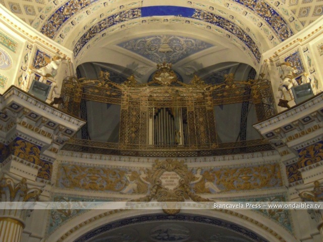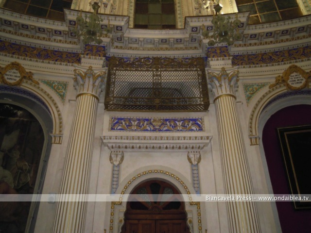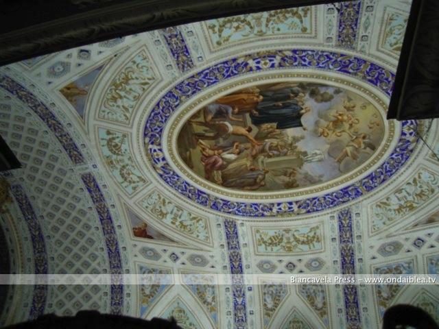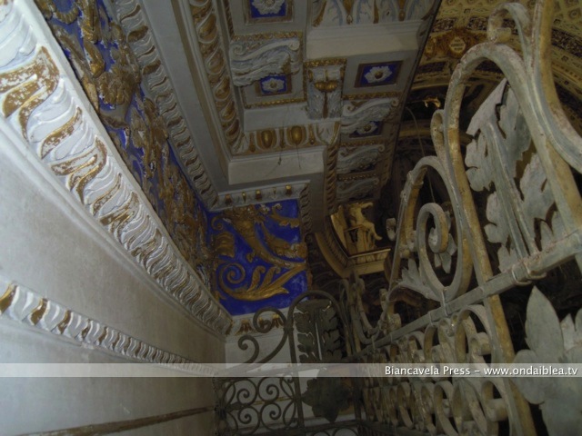 Salendo su per una scaletta si arriva al primo pianerottolo, da cui ci si può affacciare per vedere la navata da una posizione laterale. Ovviamente si tratta di un balconcino che, con una fitta maglia, non dà un’ottima visuale all’esterno, ma permette al visitatore di poter toccare con mano e ammirare le decorazioni, i colori, tutti i piccoli particolari che dal basso è quasi impossibile notare alla perfezione.