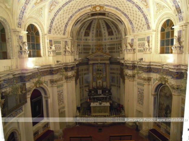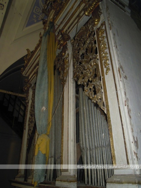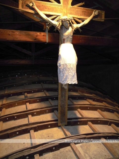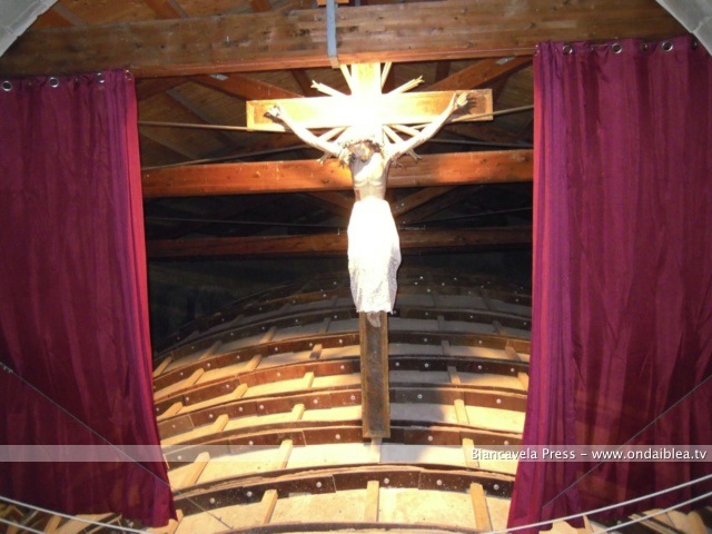 Passando dall’antico organo della chiesa, si sale al piano superiore, ovvero la parte sopra la cupola. Qui, una sorta di spettacolo si apre agli occhi di chi guarda: un sipario rosso che aprendosi “regala” una riproduzione a due dimensioni del “Cristo in gonnella” di Burgos. Per la gonnella è stato utilizzato un abito sacerdotale bianco.