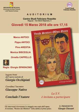Il presidente del Centro Studi “Feliciano Rossito” fa sapere che giovedì 15 marzo 2018, alle ore 17.15 presso l’Auditorium del Centro stesso (Via Ettore Majorana, 5 – Ragusa), gli attori di Teatro Utopia: Marco e Pippo Antoci, Pino Arestia, Monica Bisceglia, Ornella Cappello, per la regia di Giorgio Sparacino, leggeranno brani dell’opera teatrale “Vecchi sentieri o-ever green” di Giorgio Occhipinti.