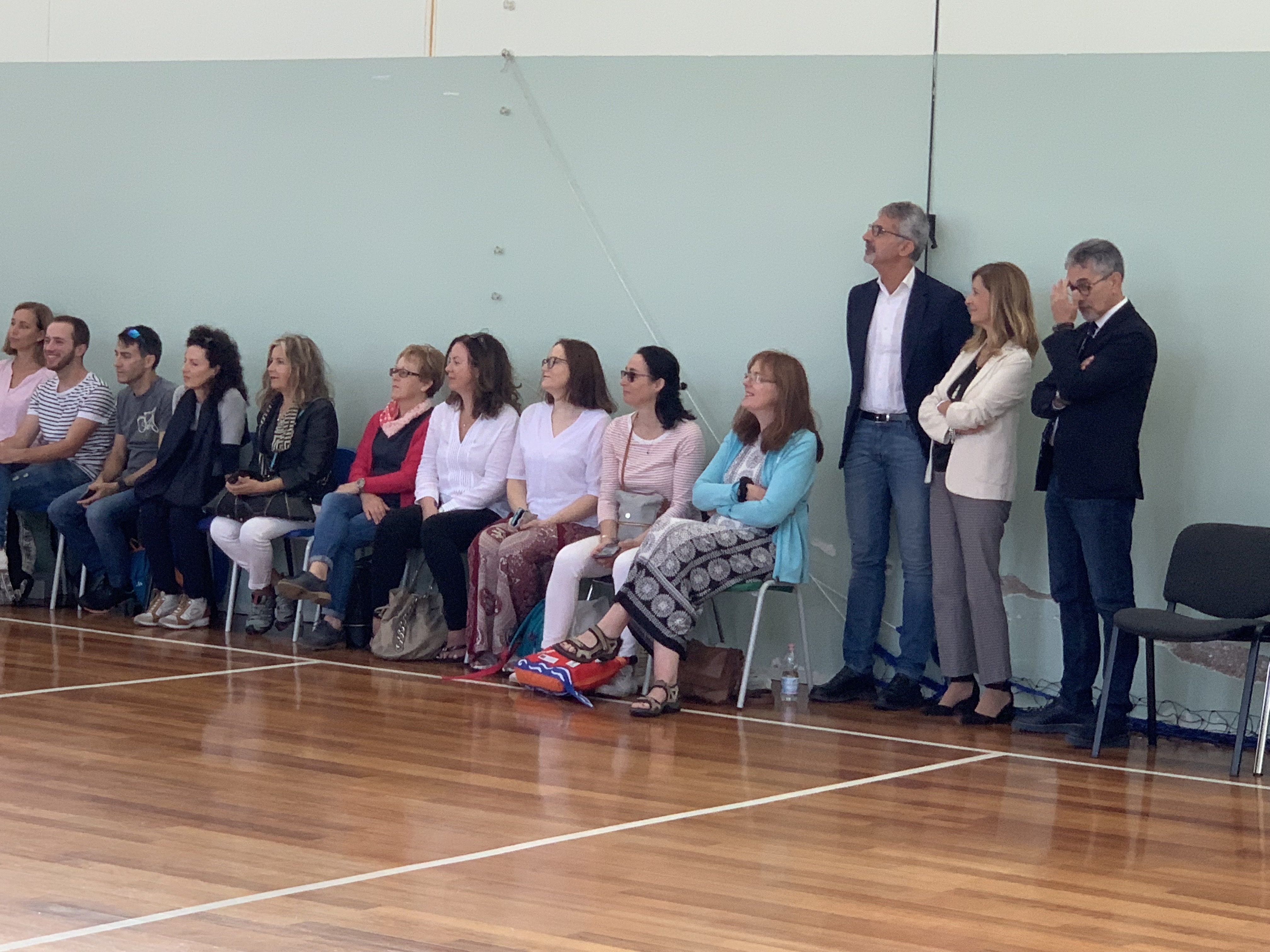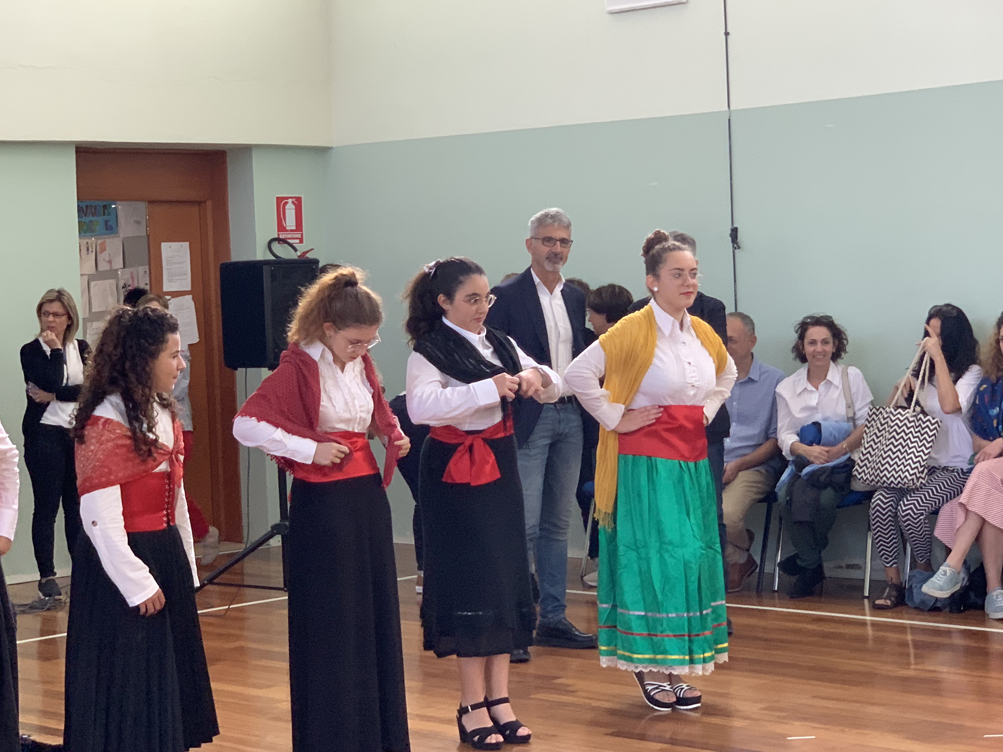 Arrivano sindaco e assessore e comincia l’omaggio folcloristico con balli e canti. Spontaneamente tutti partecipano al ballo. Ed ecco da dove cominciano gli scambi culturali, dalla curiosità e dalla voglia di imparare la cultura degli altri, dall’essere aperti e pronti alla condivisione e allo scambio reciproco di esperienze. La preside legge un discorso di benvenuto in inglese e poi in italiano e i responsabili di ogni nazione si presentano. Sembrano già tutti amici, e del resto alcuni si sono già incontrati nei momenti precedenti in ambito Erasmus (Irlanda, Polonia, Mogliano). La vicepreside Salvina Di Natale è ancora un po' preoccupata: «ce la faremo?» ci dice, e noi la tranquillizziamo: è palese l’aria di amicizia e collaborazione, andrà tutto bene (ed in effetti, ora lo possiamo dire, con lei: avevamo ragione).