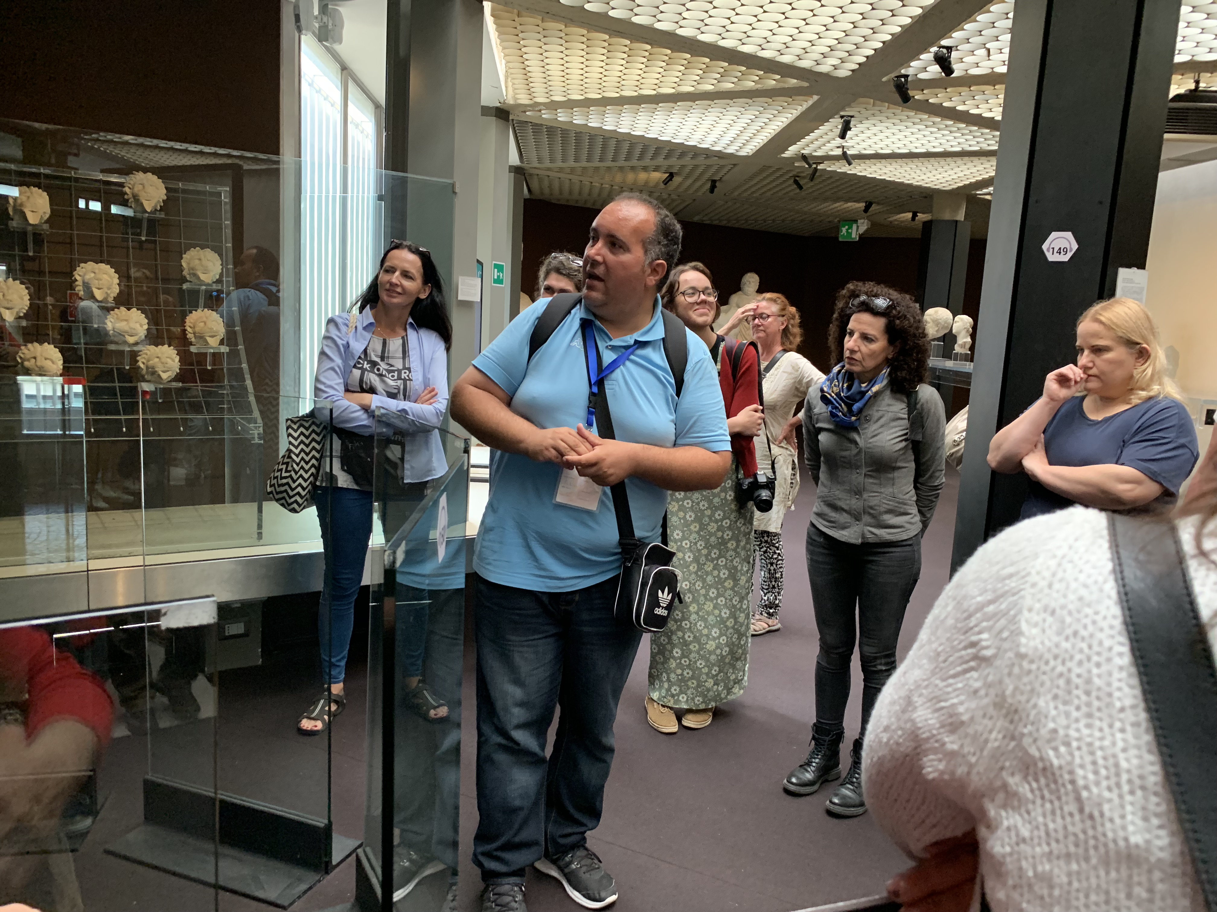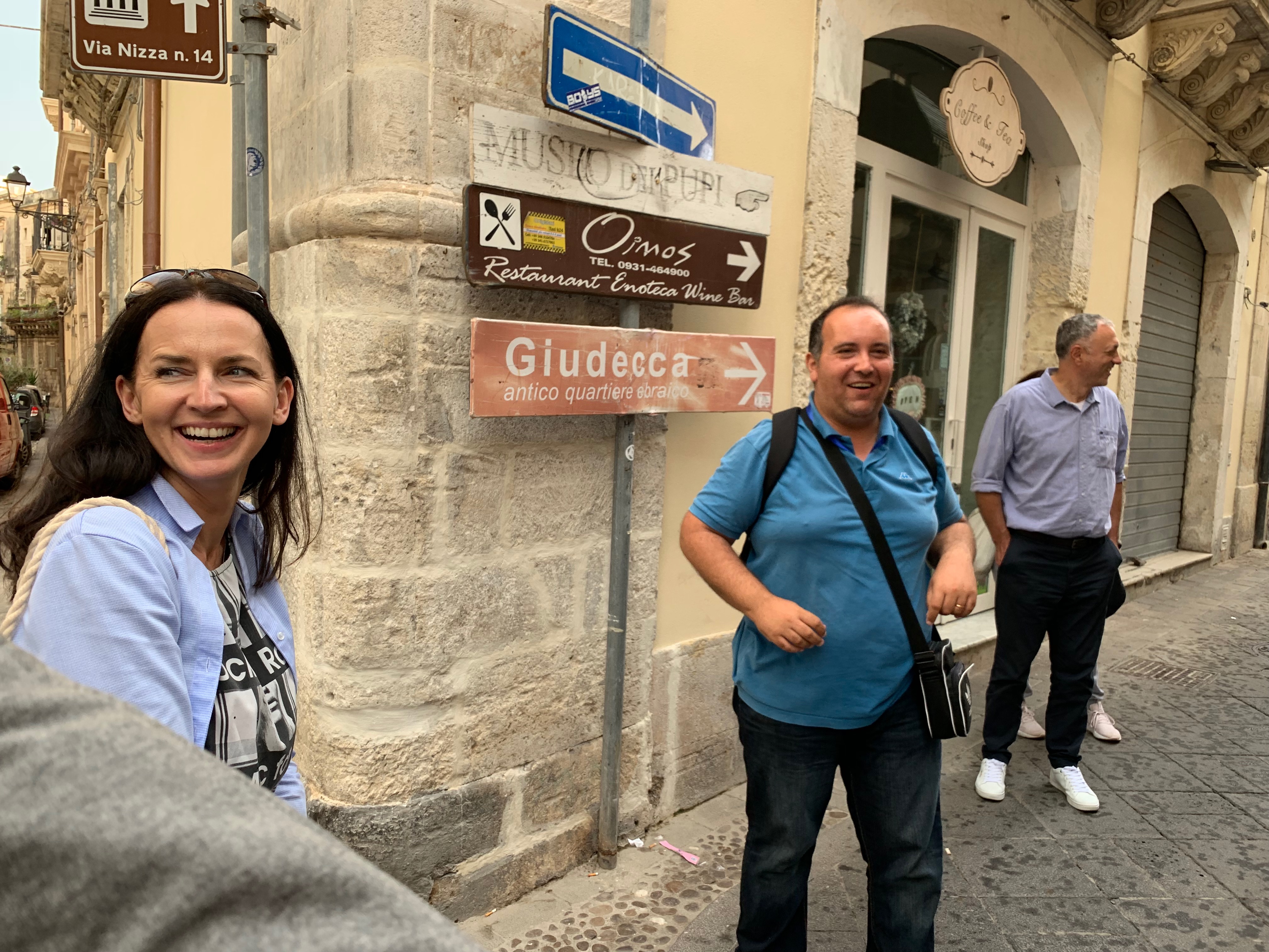 Il progetto Erasmus plus non è solo workshop ma anche scambio culturale e visita ai luoghi più importanti del territorio. E dunque non poteva mancare la splendida Siracusa, visitata domenica 21 ottobre. Ci accoglie Pietro Piazza e con maestria ci guida al Museo Paolo Orsi, descrivendo un percorso archeologico che va dal bronzo antico alla civiltà ellenistica, per Siracusa e per altre città della Sicilia. Il prof. Immanouil si sente a casa, pensando alla sua Creta: «Rivedo anche Iraklion, qui dentro», dice. E non ha torto. E sembriamo tutti un po’ greci e cretesi mentre ci avviamo poi verso la Neapolis e stanchi ci sediamo nei gradini del Teatro Greco. «Sembra anche di rivivere quella storia» dice Renata (Mogliano). Vediamo il Ninfeo, poi ascoltiamo le due (o forse tre versioni) sulla storia e leggenda dell’Orecchio di Dionisio, e le latomie, in una splendida vegetazione, facendo innumerevoli foto per immortalare ricordi. Poi giù verso Ortigia. Traversiamo a piedi il ponte sul mare, poi il pranzo e dopo ancora tutti insieme per le viuzze medievali, verso la Giudecca, luogo affascinante e quasi misterioso, che parla di ebraismo e cristianità, di religione e cultura, di “siracusanità” anche.