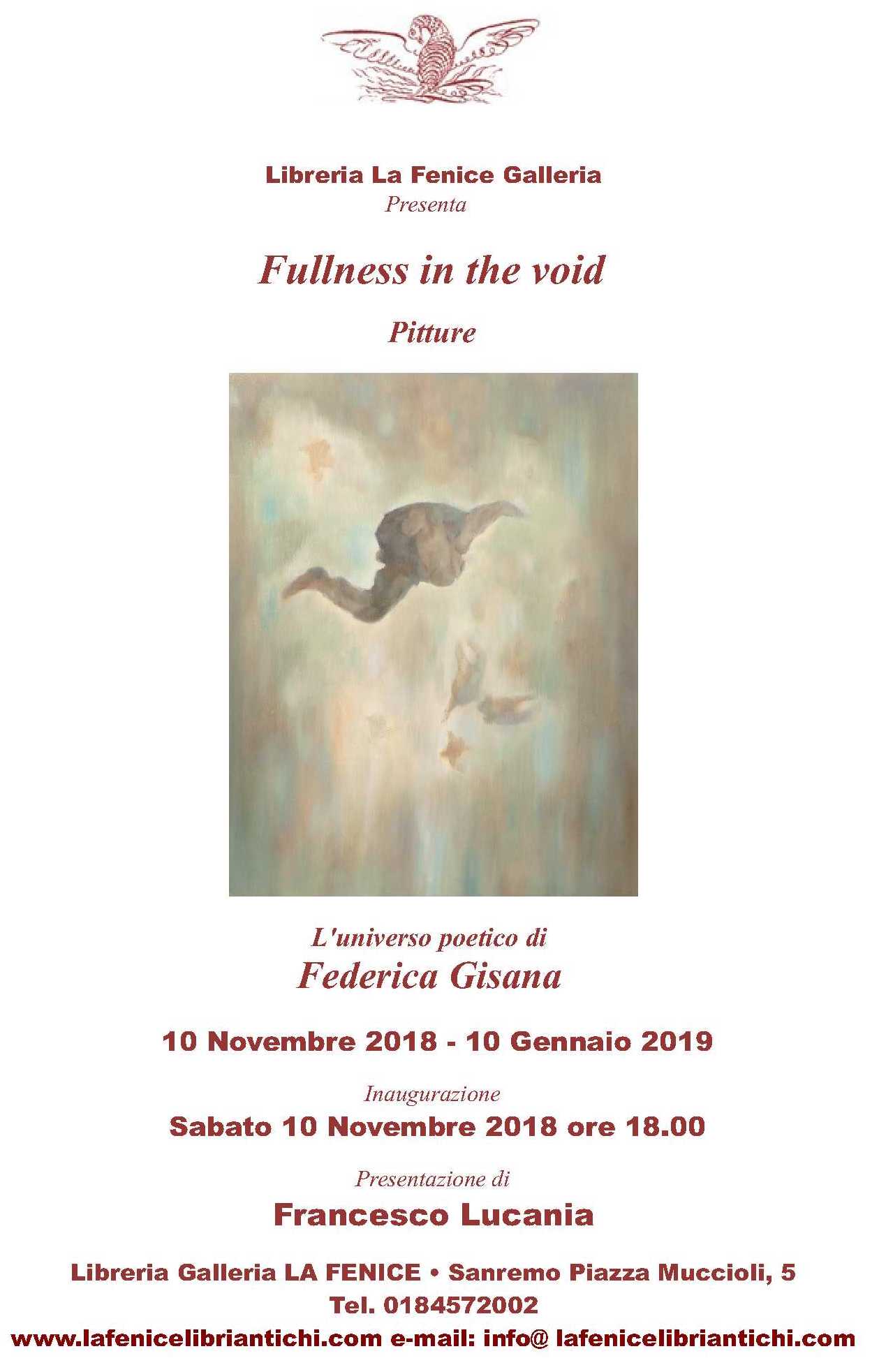 Modica, 26 ottobre 2018 – Dopo l’ottimo riscontro del pubblico e della critica avuto nei mesi estivi, la giovane modicana Federica Gisana torna ad esporre le sue opere pittoriche proponendo ai suoi estimatori una personale dal titolo “Fullness in the void” (ovvero “Pienezza del vuoto”). La mostra sarà inaugurata presso una particolare location rappresentata dalla Libreria Galleria La Fenice, a Sanremo (Piazza Muccioli, 5), dove c’è la possibilità di incontrare la poesia, letteratura e pittura. L’iniziativa, curata da Francesco Lucania, scrittore e promotore di eventi culturali, avrà luogo sabato 10 novembre alle ore 18.