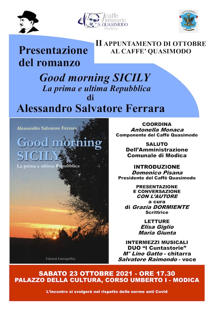 Modica, 18 ottobre 2021 — Good morning Sicily. La prima e ultima Repubblica: è il titolo del romanzo di Alessandro Salvatore Ferrara, che sarà presentato nel II “sabato letterario” di ottobre del Caffè Quasimodo di Modica, che si terrà alle ore 17.30 nell’Auditorium del Palazzo della Cultura il 23 ottobre, nel quadro della Stagione culturale 2021-22 del circolo culturale modicano.