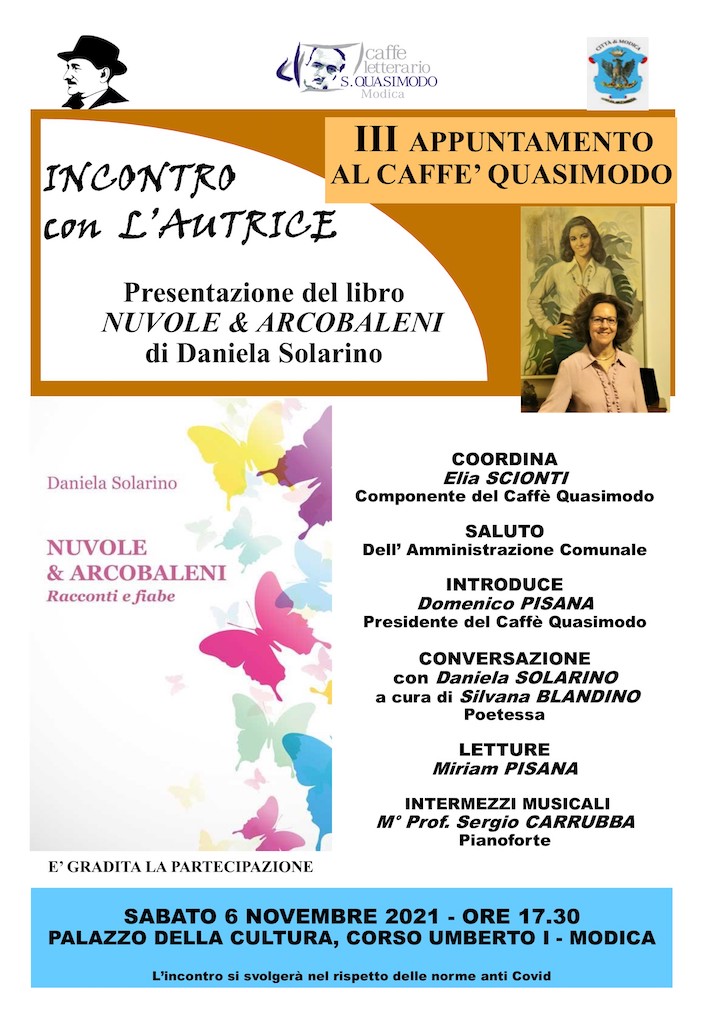 Modica, 1 novembre 2021 – “Nuvole & Arcobaleni. Racconti e fiabe”: è questo il titolo del libro della scrittrice romana di adozione Daniela Solarino, che sarà presentato nel III “sabato letterario” di ottobre del Caffè Quasimodo di Modica, che si terrà alle ore 17.30 nell’Auditorium del Palazzo della Cultura il 6 novembre, nel quadro della Stagione culturale 2021-22 del circolo culturale modicano.