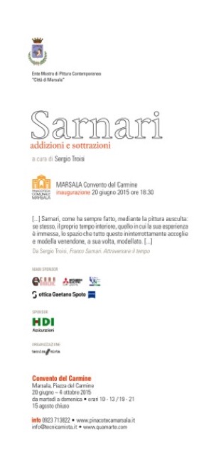 L’Ente Mostra di Pittura Contemporanea Città di Marsala, che in Sicilia si è sempre distinto per l’alto profilo critico-artistico delle mostre realizzate, e che rappresenta oggi un punto di riferimento imprescindibile per la pittura italiana in Sicilia, offre un contributo storico al mondo dell’arte siciliana, con questa profonda indagine sull’opera omnia del maestro Sarnari. Un progetto nato, a più di vent’anni dall’ultima esposizione antologica (Palazzo Sarcinelli 1995, a cura di Marco Goldin), grazie alla collaborazione con Tecnica Mista