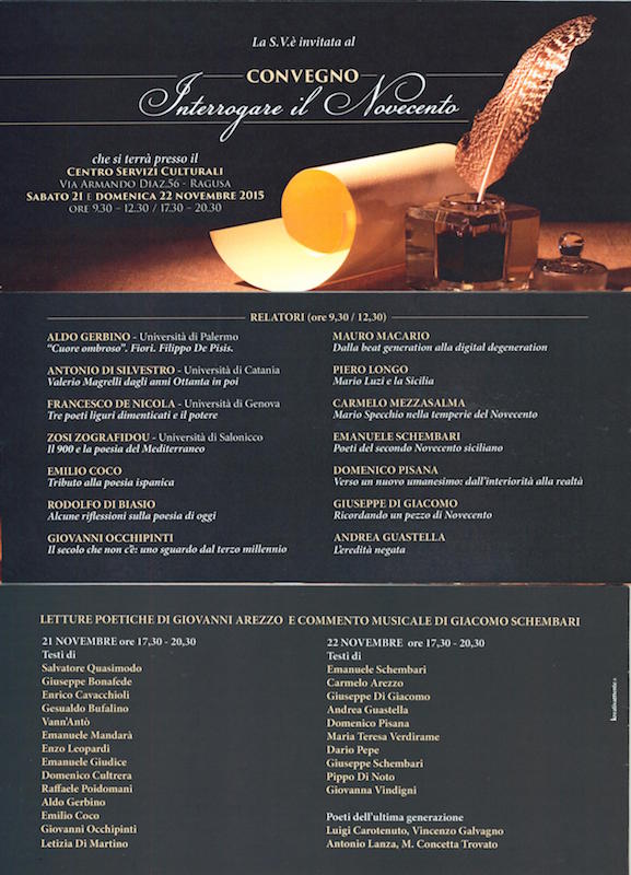 Ragusa, 16 novembre 2015 – Sabato 21 e domenica 22 novembre, presso i locali del Centro Servizi Culturali di Ragusa, in via Armando Diaz 56 (ore 9,30 -12,30 / 17,30 - 20,30), si terrà il convegno “Interrogare il Novecento” che chiamerà a raccolta intellettuali di varia estrazione, quali docenti universitari, storici della letteratura, traduttori, scrittori, poeti, critici letterari italiani e stranieri.