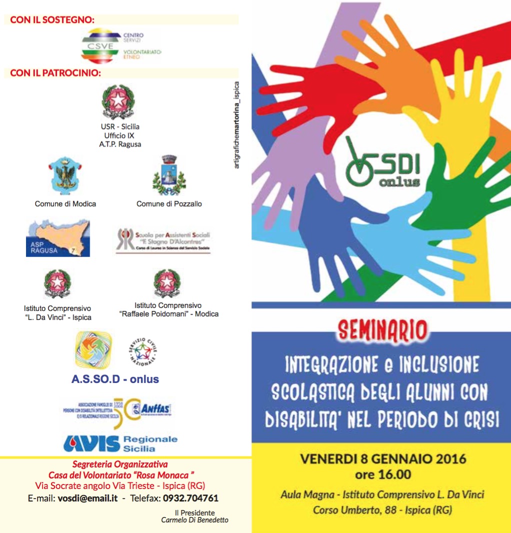 #Ispica, 5 gennaio 2016 – A Ispica seminario sul tema "integrazione e inclusione scolastica degli alunni con disabilità" , organizzato dalla Vo.S.Di - Onlus, che si terrà Venerdì 8 Gennaio 2016 alle ore 16:00 presso l'aula magna dell'Istituto Comprensivo " L. Da Vinci ".