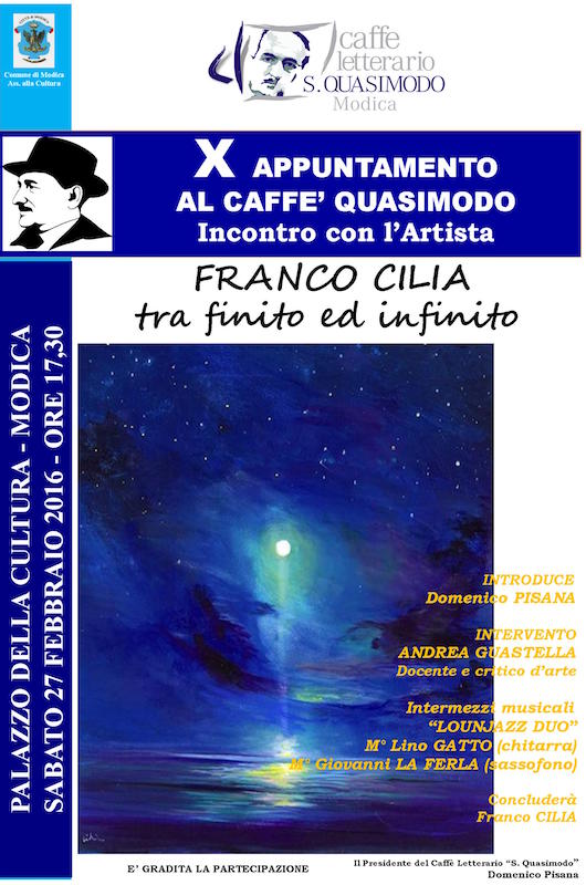 #Modica, 22 febbraio 2016 – Incontro con l’arte al Caffè Quasimodo di Modica. Il X appuntamento del circolo culturale modicano sarà infatti dedicato alla pittura dell’artista Franco Cilia, le cui opere saranno presentate dal critico e docente di storia dell’arte del Liceo classico e artistico “Galilei-Campailla” di Modica, Andrea Guastella, il prossimo 27 febbraio nell’Auditorium del Palazzo della Cultura alle ore 17,30.