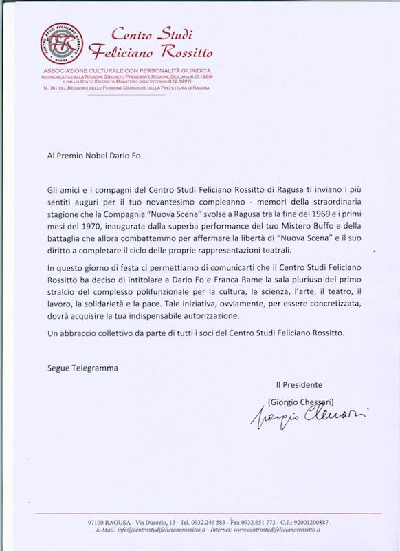 Anche Giorgio Chessari, nella qualità di presidente del Centro studi “Feliciano Rossitto” di Ragusa, ha inviato a Dario Fo sentiti ed affettuosi auguri per il suo novantesimo compleanno, “memori della straordinaria stagione che la Compagnia Nuova Scena svolse a Ragusa tra la fine del 1969 e i primi mesi del 1970, inaugurata dalla superba performance del tuo Mistero Buffo e della battaglia che allora combattemmo per affermare la libertà di Nuova Scena e il suo diritto a completare il ciclo delle proprie rappresentazioni teatrali”.