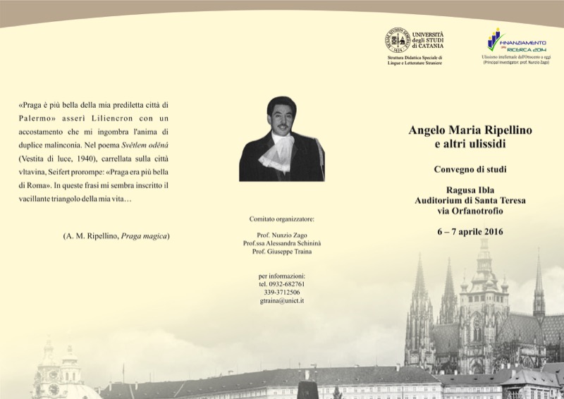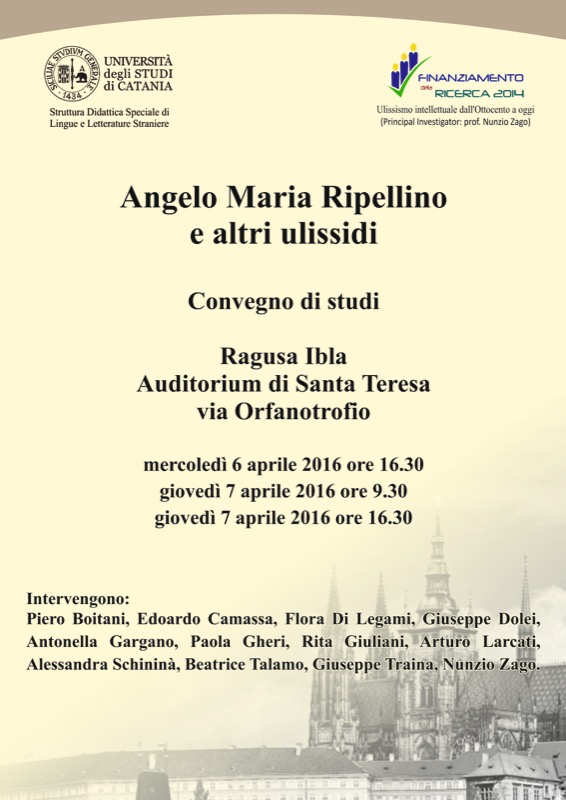 Organizzato dai professori Nunzio Zago, Alessandra Schininà e Giuseppe Traina (della Struttura Didattica Speciale di Lingue e letterature straniere di Ragusa) tra il 6 e il 7 aprile 2016 si terrà a Ragusa Ibla, presso l’Auditorium di Santa Teresa di via Orfanotrofio, il convegno di studi Angelo Maria Ripellino e altri ulissidi.