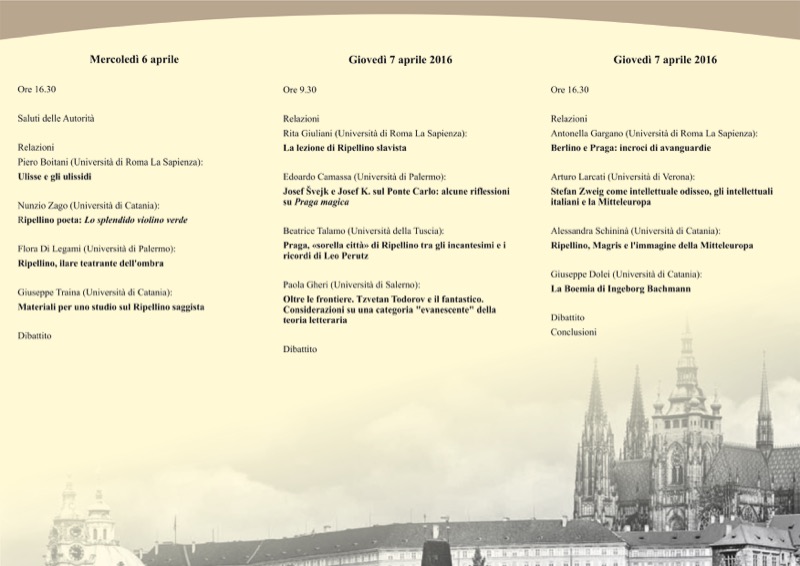 I relatori rifletteranno sulla figura di Ripellino, l’autore di “Praga magica” e di altri libri affascinanti, poeta e saggista sopraffino ma anche moderno ulisside intellettuale a cavallo tra Sicilia, Italia, Mitteleuropa e Russia, e su altre figure di scrittori che hanno creato “ponti” di fondamentale importanza tra queste e altre culture: Leo Perutz, Stefan Zweig, Ingeborg Bachmann, Tzvetan Todorov, Claudio Magris…