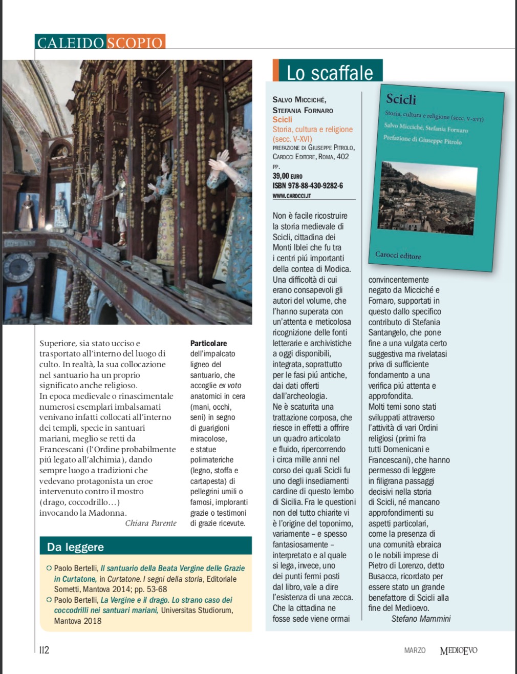 Il mensile Medioevo di marzo, a firma di Stefano Mammini (p. 112) ha recensito il volume di Salvo Micciché e Stefania Fornaro, "Scicli. Storia, cultura e religione (secc. v-xvi)", collana "Studi storici" Carocci Editore, 2018