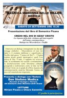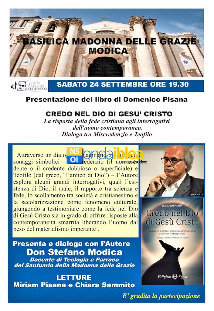 Modica, 14 settembre 2022 — Sabato 24 settembre, alle ore 19.30, si terrà presso il Santuario della Madonna delle Grazie di Modica la presentazione del libro di Domenico Pisana (Presidente del Caffè Letterario Quasimodo), pubblicato nel mese di Maggio, dal titolo “Credo nel Dio di Gesù Cristo - La risposta della fede cristiana agli interrogativi dell’uomo contemporaneo, Dialogo tra Miscredenzio e Teofilo”, già lanciato lo scorso maggio al Salone Internazionale del libro di Torino dalla casa editrice “Edizioni Segno” di Udine.