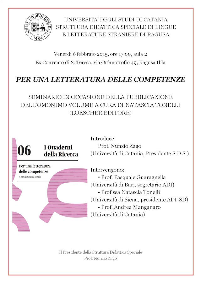 Ragusa, 29 gennaio 2015 – La Struttura Didattica Speciale di Lingue e Letterature Straniere dell'Università di Catania, con sede a Ragusa Ibla, comunica che il 6 febbraio 2015, alle ore 17, si terrà presso la sede della Struttura (via Orfanotrofio 49, Ragusa Ibla, aula 2) un seminario dal titolo "Per una letteratura delle competenze".