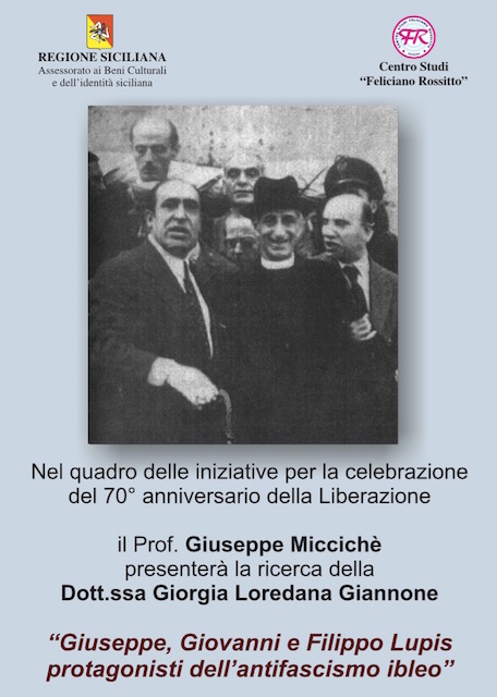 Ragusa, 23 aprile 2015 – Nel quadro delle iniziative per la celebrazione del 70° anniversario della Liberazione, mercoledì 29 aprile 2015, alle ore 18, nei locali del Centro Studi “Feliciano Rossitto”, Via Ducezio n. 13 a Ragusa, il Prof. Giuseppe Micciché, presenterà la ricerca della Dott.ssa Giorgia Loredana Giannone, “Giuseppe, Giovanni e Filippo Lupis protagonisti dell’antifascismo ibleo”.