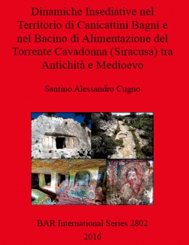 Canicattini Bagni, 6 giugno 2016 – È uscita la monografia del giovane archeologo canicattinese, Santino Alessandro Cugno, dal titolo "Dinamiche insediative nel territorio di Canicattini Bagni e nel bacino di alimentazione del torrente Cavadonna (SR) tra Antichità e Medioevo", all'interno della prestigiosa collana scientifica British Archaeological International Series (n. 2802, Oxford, 2016), con la prefazione del professore Dario Palermo (Ordinario di Archeologia Classica - Università di Catania) e la presentazione del professore Giovanni Uggeri (Emerito di Topografia Antica - Università La Sapienza di Roma).