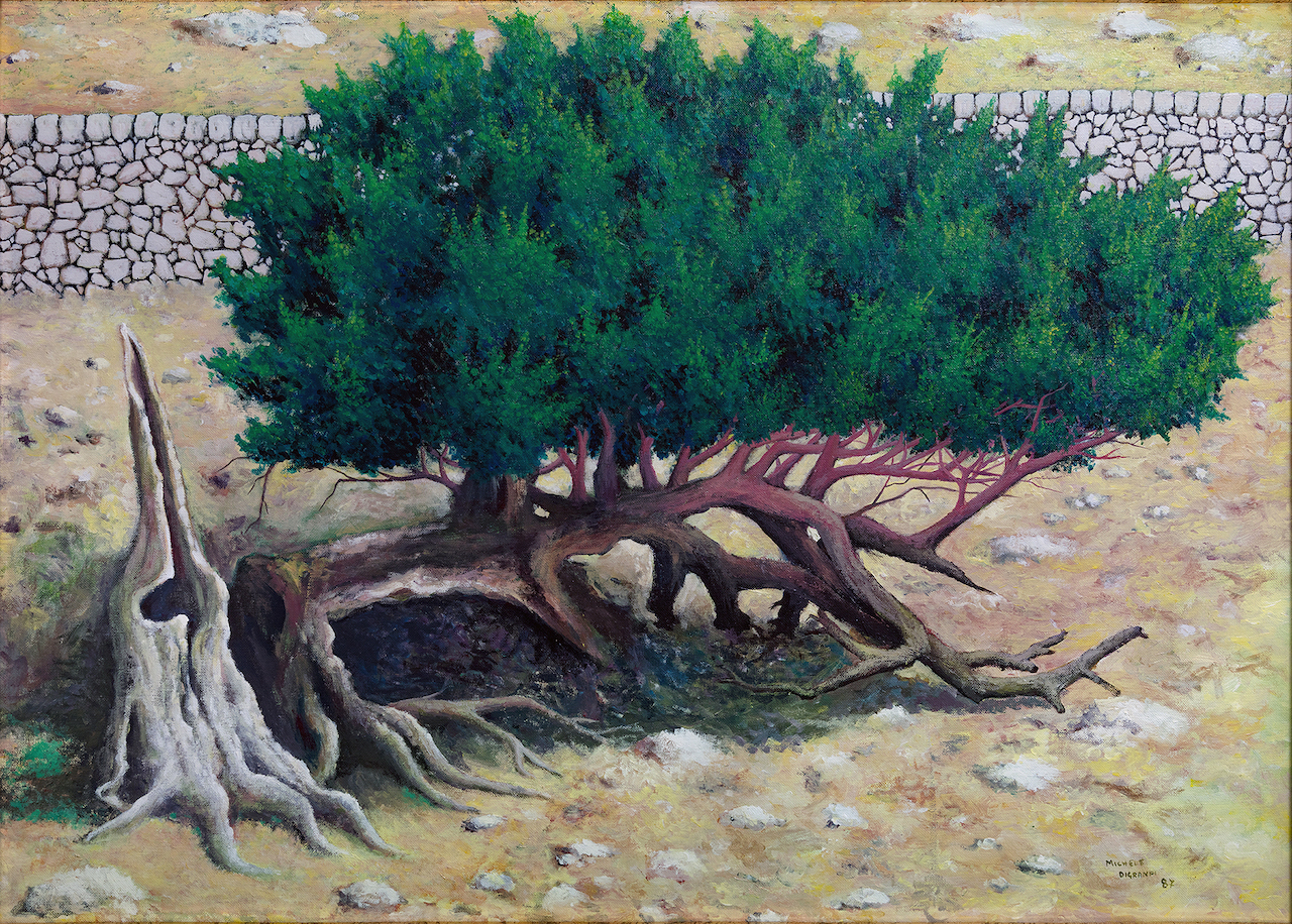 Le fresche fronde, dipinte con le varie tonalità di un verde intenso e brillante, tipico dei colori acrilici, svettano come mani oranti, liete di ringraziare il cielo per la florida rinascita e per lo scudo protettivo del muro a secco.
