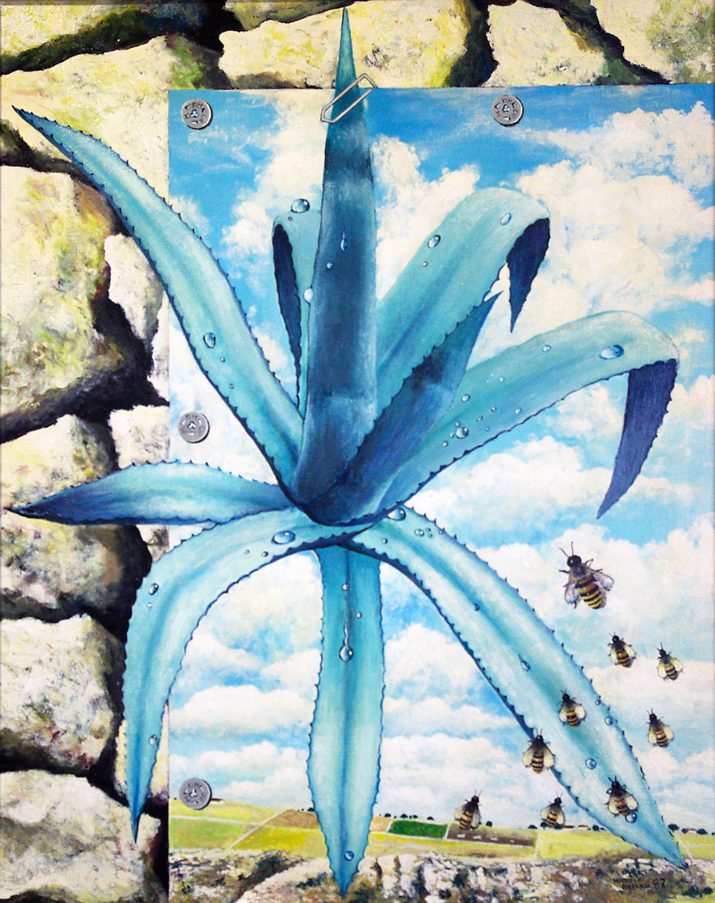 Una carnosa e fresca agave emerge, in un “volo” quasi smorzato, (graffetta) da un cielo che preannuncia precipitazioni, per dominare, da “regina assoluta” su un paesaggio che appare lontano e poco percettibile. Tralasciando questa prima osservazione dell’opera “Trapianto n. 1”, ci si immerge in una visione più intimistica della concatenazione dei vari dettagli, per scorgere, nella figura della pianta, la metafora del doloroso (spine) processo di crescita interiore, vissuto dall’uomo come libera scelta, per il raggiungimento di una piena maturità psicologica. Si tratta del passaggio da un atteggiamento di distacco ed isolamento dal mondo (paesaggio lontano), tipico della giovanissima età, a un successivo status caratterizzato da quella ferma riflessione (volo interrotto dalla graffetta) che porta alla coscienza delle proprie responsabilità e all’accettazione, mai passiva, degli eventi, spesso contrari alle aspettative, che si prevedono come difficili ed imminenti (piogge a catinelle). Solo quando l’individuo sarà in grado di affrontarli con il vigore ereditato dagli atavici valori (muro) e con la nuova consapevolezza del bisogno dell’aiuto di tutta la comunità (gruppo di api), potrà essere considerato “persona adulta”.