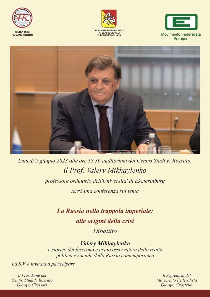 Ragusa, 30 maggio 2023 — Lunedì 5 giugno 2023, alle ore 18.30, presso l’auditorium del Centro Studi Feliciano Rossitto (Via Ettore Majorana 5, Ragusa), il prof. Valery Mikhaylenko (dell’Università di Ekaterinburg) terrà una conferenza sul tema: «La Russia nella trappola imperiale: alle origini della crisi».