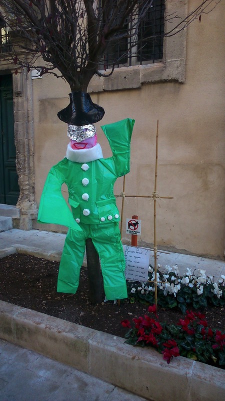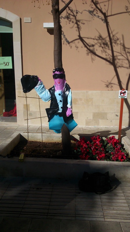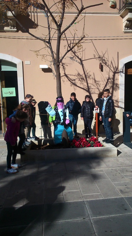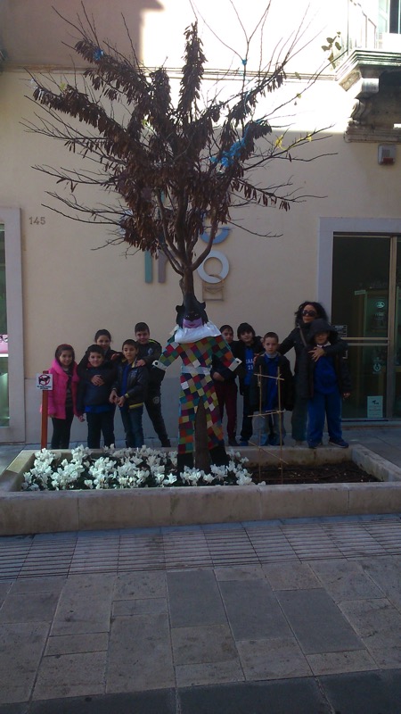 Le chiome degli alberi all'interno delle aiuole sono state “colorate” con stelle filanti ad addobbi vari mentre i tronchi sono serviti agli alunni per sistemare le sagome di alcuni personaggi famosi del Carnevale, come Giufà, Peppe Nappa, Arlecchino, che sono stati realizzati utilizzando materiale riciclato.
