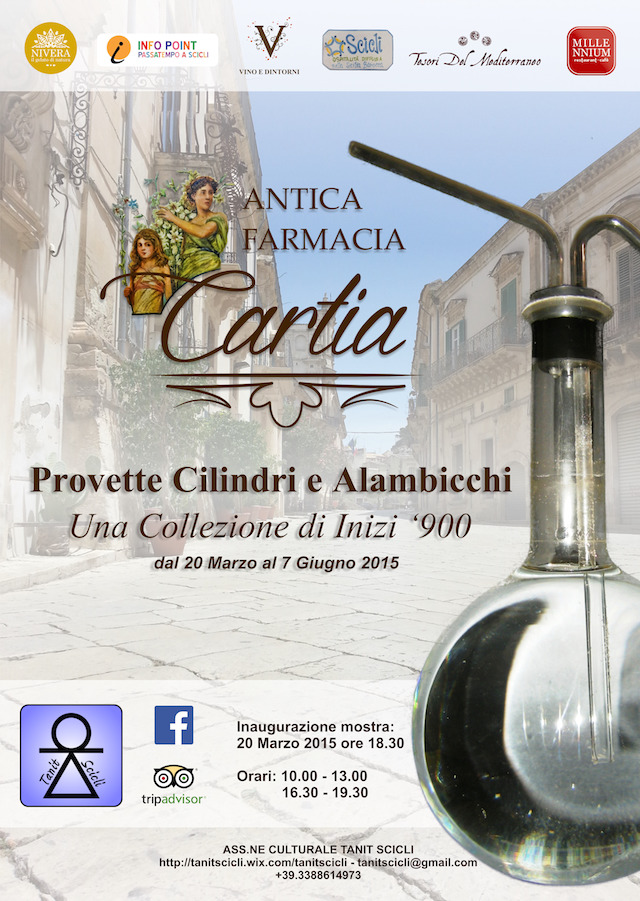 Per festeggiare ciò, l’Associazione Culturale “Tanit Scicli” che si occupa della sua fruizione e cura ha deciso di cambiare veste alla Farmacia, esponendo i protagonisti del suo cuore segreto, il laboratorio galenico: “Provette, cilindri e alambicchi. Una collezione di inizi ‘900” sarà infatti il titolo della mostra tematica che sarà allestita nei locali dell’Antica Farmacia dove sarà visitabile ogni giorno dal 20 marzo al 7 giugno prossimi, in Via Francesco Mormino Penna a Scicli, la via dichiarata Patrimonio dell’Umanità dall’UNESCO nel 2002.