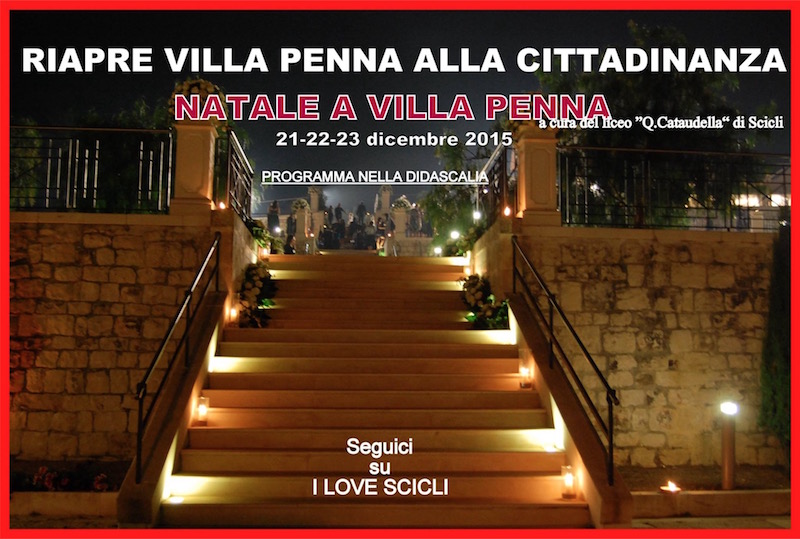 #Scicli, 18 dicembre 2015 – L’Istituto Quintino Cataudella, diretto dal prof. Enzo Giannone e la Commissione Straordinaria apriranno Villa Penna in occasione del Natale 2015, restituendo il meraviglioso sito alla fruizione degli sciclitani e dei turisti.