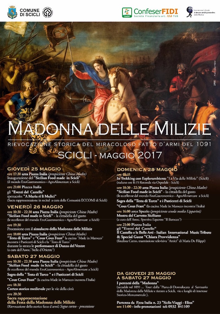 Ma il programma inizia giovedì, con la rappresentazione in piazza de “A Maria di li Mulici” da parte della comunità religiosa “Eccomi Manda Me”. Da venerdì a domenica, in piazza Italia e in via Tagliamento la Fiera delle Milizie, che sarà allietata dal ritorno dei friscaletti siciliani, insieme a una mostra di carretti nella parte alta della piazza. Prevista una degustazione di cous cous, in omaggio all'integrazione culturale fra i paesi del bacino del Mediterraneo, il trekking di Esplorambiente, domenica 28 mattina, da Scicli verso l’Eremo delle Milizie, e la sagra delle Teste di Turco, il dolce tipico di Scicli, un grande bignè ripieno di crema pasticciera.
