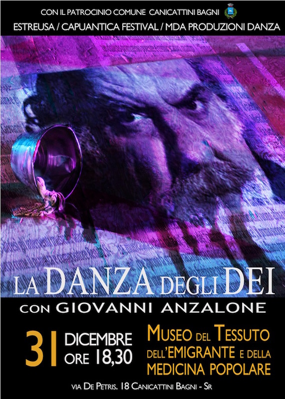 #Canicattini Bagni, 30 dicembre 2015 – Si terrà domani, Giovedì 31 Dicembre 2015 alle ore 18:30 al Museo Tempo (Museo del Tessuto, dell’Emigrazione, della Medicina Popolare) di Canicattini Bagni in via De Pretis 18, il recital “La Danza degli Dei” con Giovanni Anzalone.