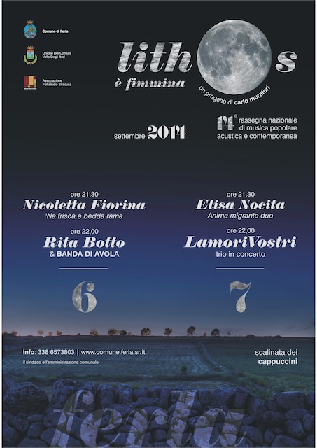 È dedicata alla “fimmina” e alla voce delle sue molteplici emozioni la XIV Edizione di “Lithos”, rassegna nazionale di musica popolare acustica e contemporanea che ogni primo fine settimana di Settembre, risveglia con i propri suoni la suggestiva scalinata del Convento dei Cappuccini di Ferla, cornice ideale della manifestazione.