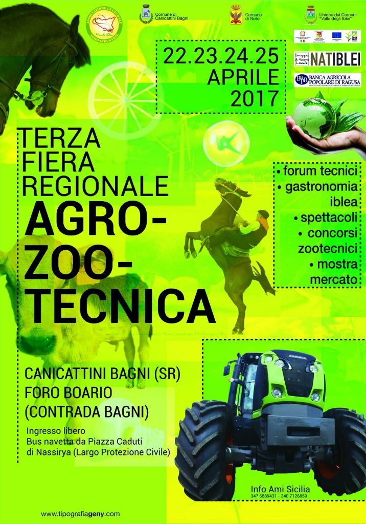 Canicattini Bagni, 19 aprile 2017 – Tutto pronto al Foro Boario di Canicattini Bagni per la 3° edizione della Fiera Regionale Agro Zootecnica che si terrà dal 22 al 25 Aprile 2017, promossa dall’AMI, l’Associazione culturale Agro Industrie “Monti Iblei”, presieduta da Nicola Antonio Uccello, in collaborazione con l’Amministrazione comunale di Canicattini Bagni, il Gal NatIblei, l’Agenzia di Sviluppo degli Iblei - Gal Val d’Anapo, il patrocinio del Comune di Noto e dell’Unione dei Comuni “Valle degli Iblei”, e il contributo di aziende private.