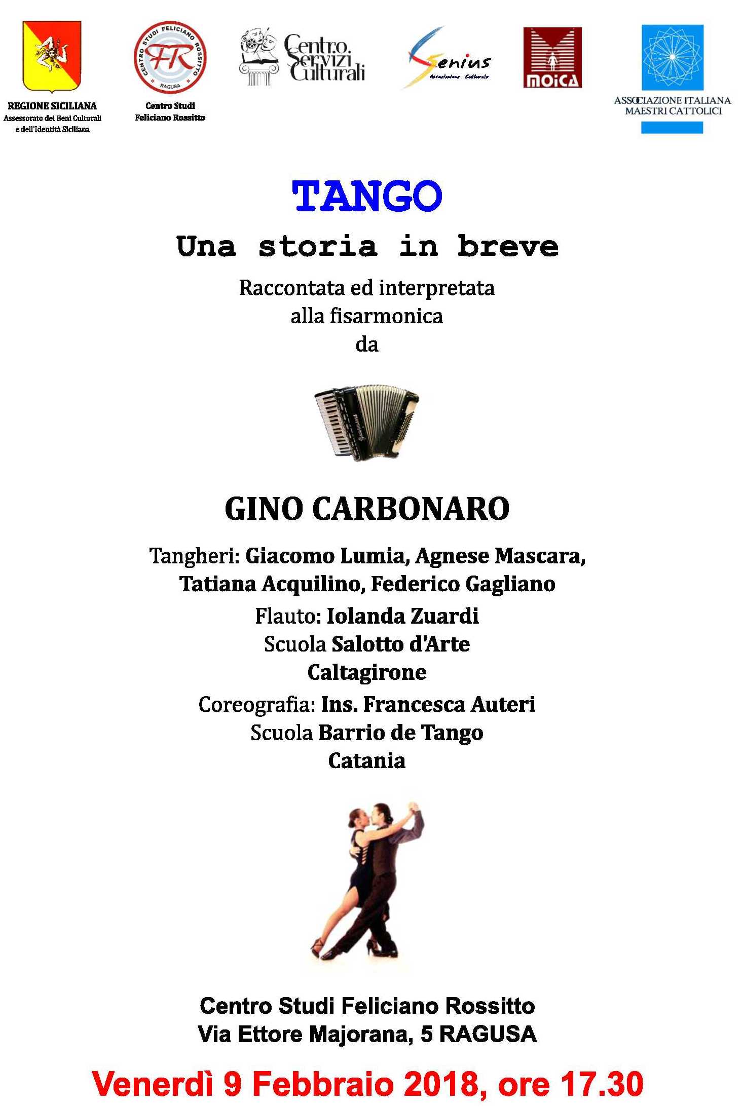 Ragusa, 1 febbraio 2018 – Venerdì 2 febbraio 2018, alle ore 10.00, nei locali del Centro Studi “Feliciano Rossitto”, si terrà una conferenza stampa per illustrare “Tango Una storia in breve” Raccontata ed interpretata alla fisarmonica da Gino Carbonaro.