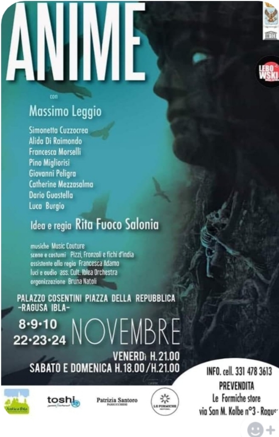 È quanto si è avuto modo di apprezzare, lo scorso fine settimana, con lo spettacolo “Anime”, nell’intrigante location di palazzo Cosentini a Ragusa Ibla, per la regia di Rita Fuoco Salonia. La mise en scène ha fatto registrare la straordinaria partecipazione dell’attore ragusano Massimo Leggio, insieme agli altri attori Simonetta Cuzzocrea, Alida Di Raimondo, Francesca Morselli, Pino Migliorisi, Giovanni Peligra, Catherine Mezzasalma, Dario Guastella, Luca Burgio.