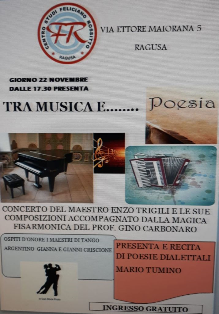 Ragusa, 19 novembre 2019 – Venerdì 22 novembre 2019, alle ore 17.30, presso l’Auditorium del Centro Studi “Feliciano Rossitto” di Ragusa (Via Ettore Majorana, 5) si terrà l’iniziativa che ha per titolo “Tra musica e… poesia”.