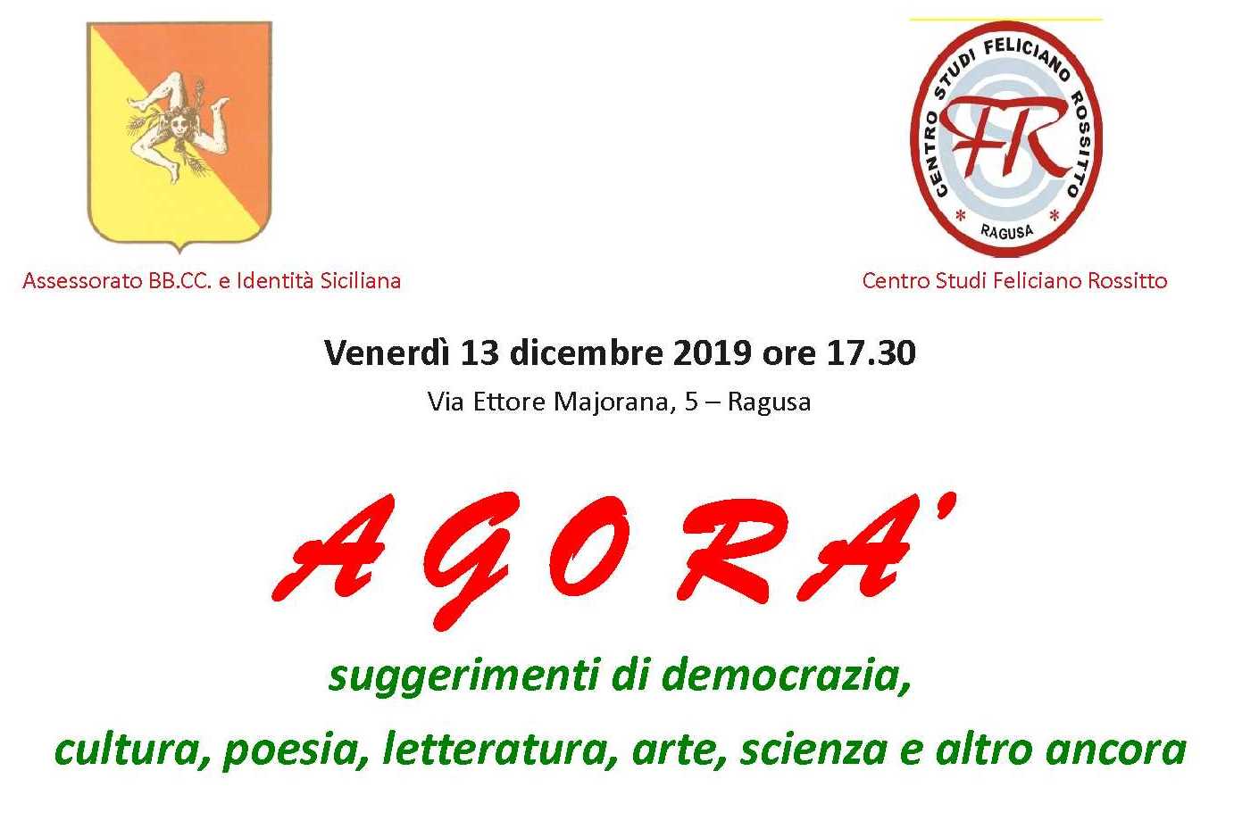 Ragusa, 3 dicembre 2019 – Al Centro Studi Feliciano Rossitto (Via Ettore Majorana 5, Ragusa), venerdì 13dicembre, alle ore 17.30, si terrà l’evento dal titolo “Agorà”. Si tratta di una serata caratterizzata, secondo gli organizzatori, da «suggerimenti di democrazia, cultura, poesia, letteratura, arte, scienza e altro ancora».
