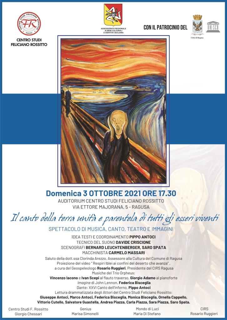 Domenica 3 ottobre alle ore 17.30, nell‘auditorium del Centro Studi Feliciano Rossitto (Via Ettore Majorana 5), andrà in scena "Il canto della terra. Unità e parentela di tutti gli esseri viventi".