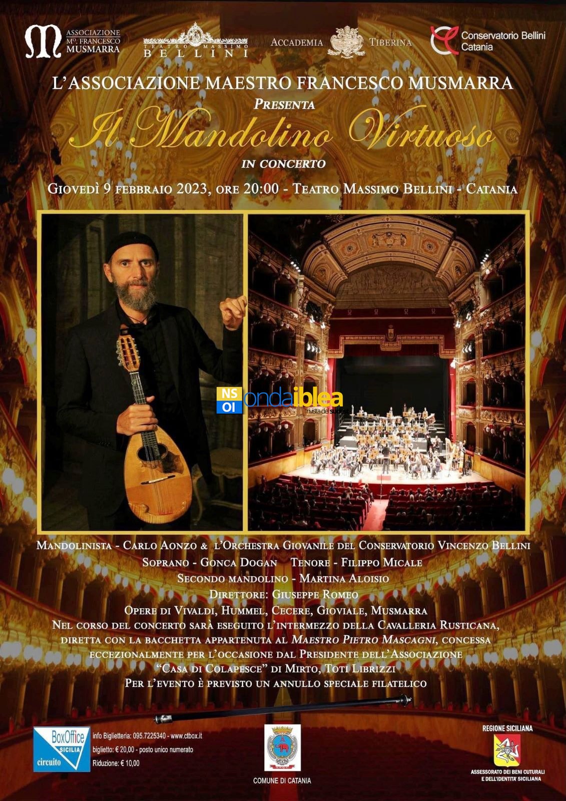 Di qui nasce l’idea di promuovere una serata di gala che illuminerà il palcoscenico del Teatro Massimo Bellini di Catania. Una performance artistica – inizialmente fissata per giovedì 9 febbraio, ma rimandata a causa di una allerta meteo a sabato 11 febbraio alle ore 20 – che prende come titolo “Il Mandolino Virtuoso”.