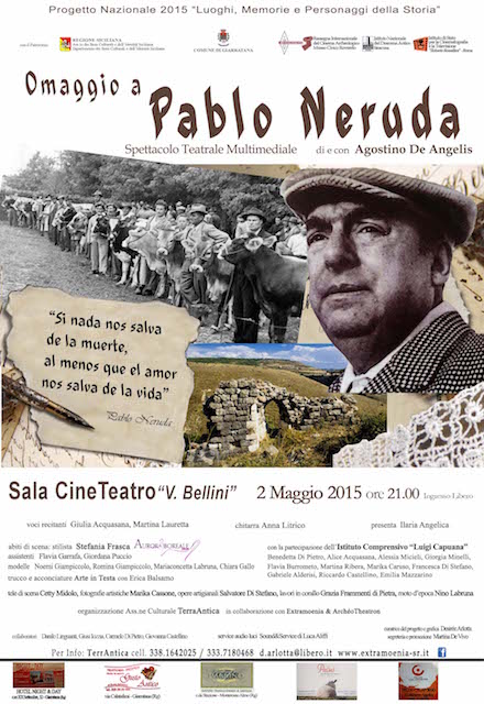 Per il grande spessore che il poeta cileno riveste nella letteratura internazionale, l’attore regista Agostino De Angelis intende ricordarlo il 2 maggio 2015 con il suo spettacolo teatrale multimediale “Omaggio a Pablo Neruda", presso il Cine Teatro “V. Bellini” di Giarratana, alle ore 21.00.