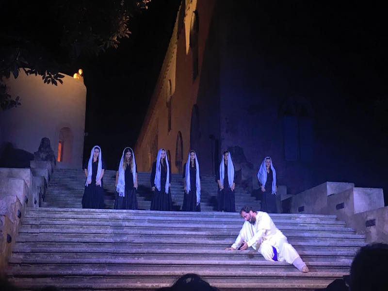 Poi i giovani attori della compagnia teatrale, ovvero Benedetta D’Amato, Monica Firullo, Federica Guglielmino, Gaia Guglielmino, Francesco Piccitto (da segnalare la sua coinvolgente interpretazione nel ruolo del messaggero), Micaela Sgarlata, Gessica Trama e i piccoli Giovanni Fiaccavento e Giovanni Candiano che hanno interpretato i figli di Medea. Nella magica scenografia proposta sulla scalinata del castello, tutti hanno contribuito a ricreare l’atmosfera del teatro classico con i suoi aulici fasti ed i suoi drammi.