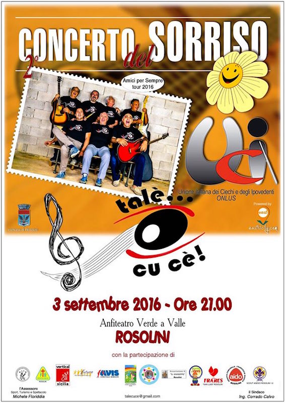 Il Concerto di Solidarietà nasce da un’idea dei Talè cu c’è, la band rosolinese che ha inserito l’evento nella fortunata tournée estiva “Amici per sempre”, e ha visto sin da subito la sinergica collaborazione del mondo del volontariato che opera a Rosolini e dell’Amministrazione comunale. La rete, rispetto alla prima edizione, vanta il supporto di ben tredici associazioni che sono scese in campo per emozionare un pubblico speciale.