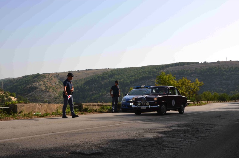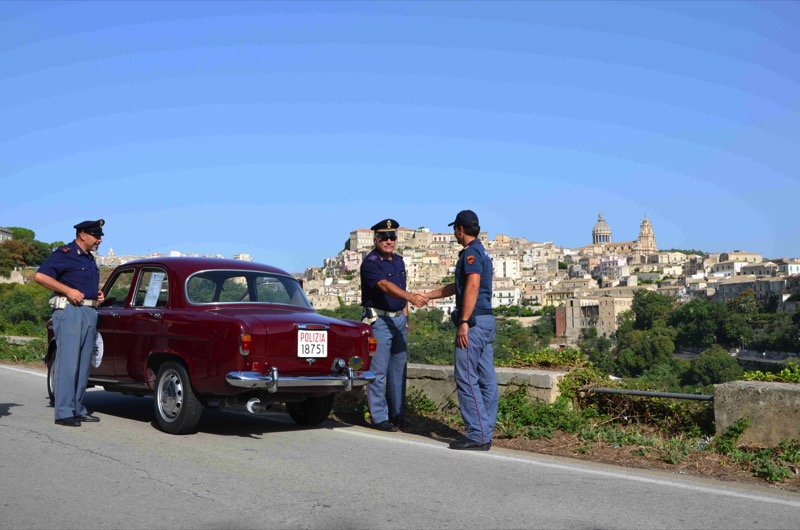 Nelle foto uno scherzoso controllo di una pattuglia di volante attuale con “paletta” d’ordinanza all’auto storica.