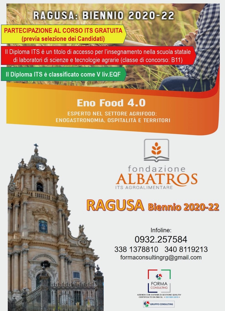 Ragusa, 6 agosto 2020 — Oggi, 6 agosto alle 16, presso la sala multiuso del Comune in Contrada Mugno (zona Artigianale) sarà presentato il nuovo corso ITS per il biennio 2020-22: Eno Food 4.0, esperto nel settore agrifood - enogastronomia, ospitalità e territori.